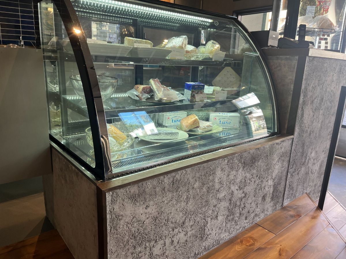 おしゃれな店内をテーブル席側へ回るとフレッシュタイプやウォッシュタイプなどのチーズ類と生ハムブロックの陳列されたショーケース。