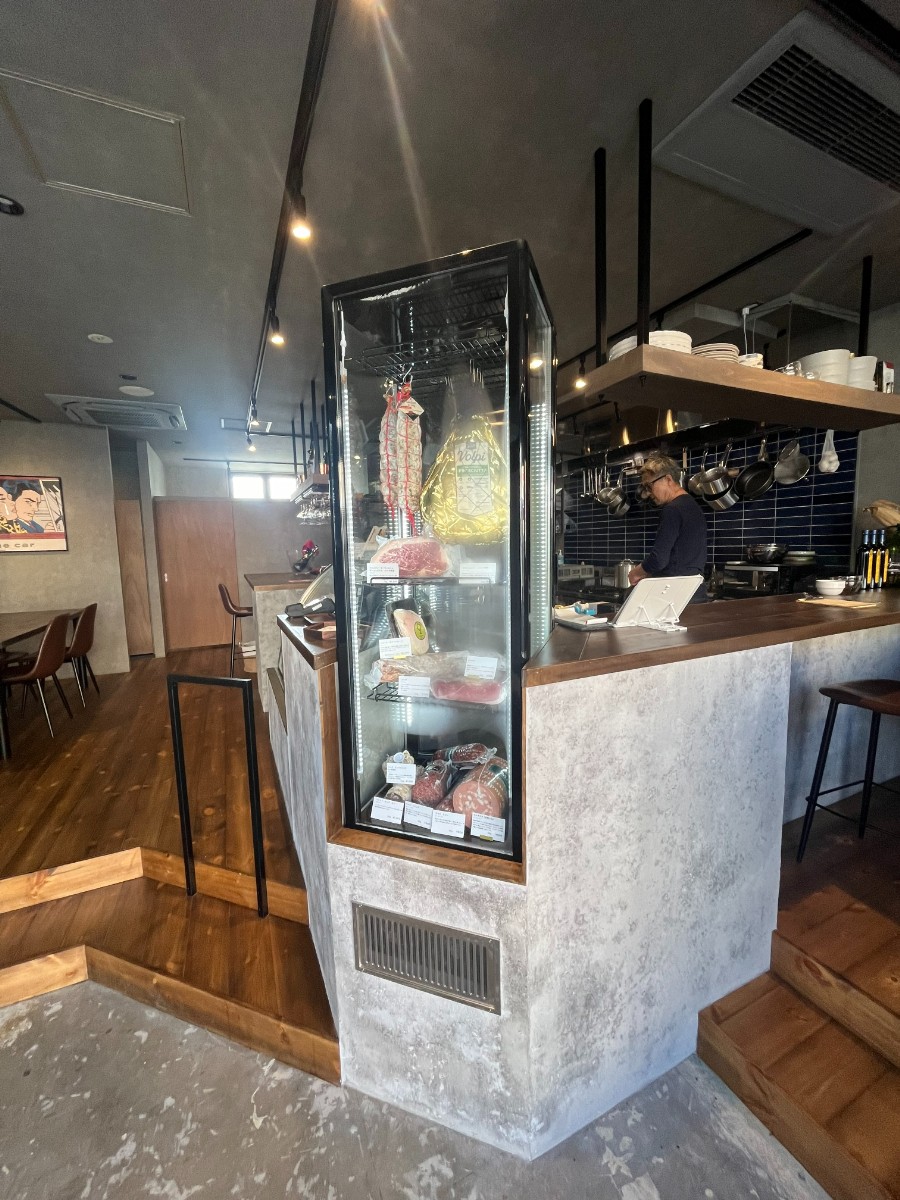 店内に入るとまず吊るした生ハムやサラミが入った冷蔵ショーケースがお出迎え。